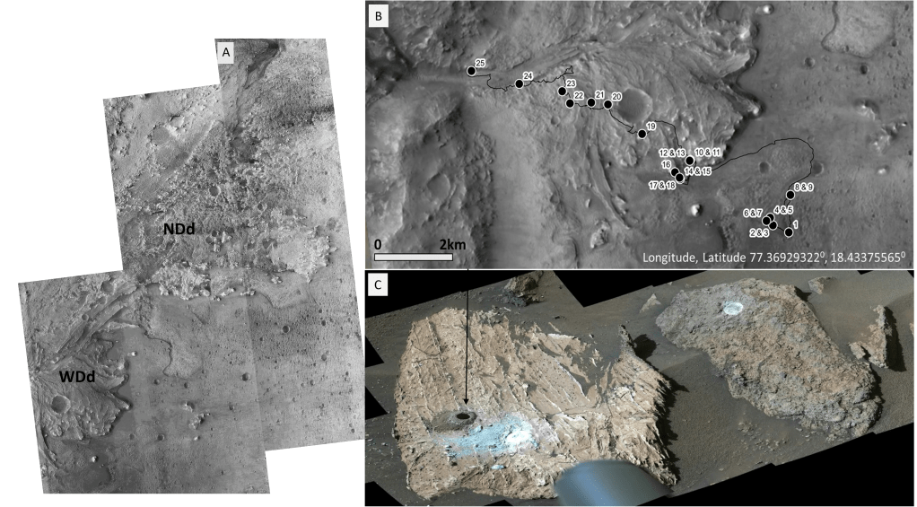 Elaboración de mapas detallados de superficies planetarias mediante datos satelitales, modelos 3D. Imagen: Ruta de Perseverance en Crater Jezero, Marte. Ruta y ubicación de muestras. Mars 2020: Perseverance Rover – NASA Science