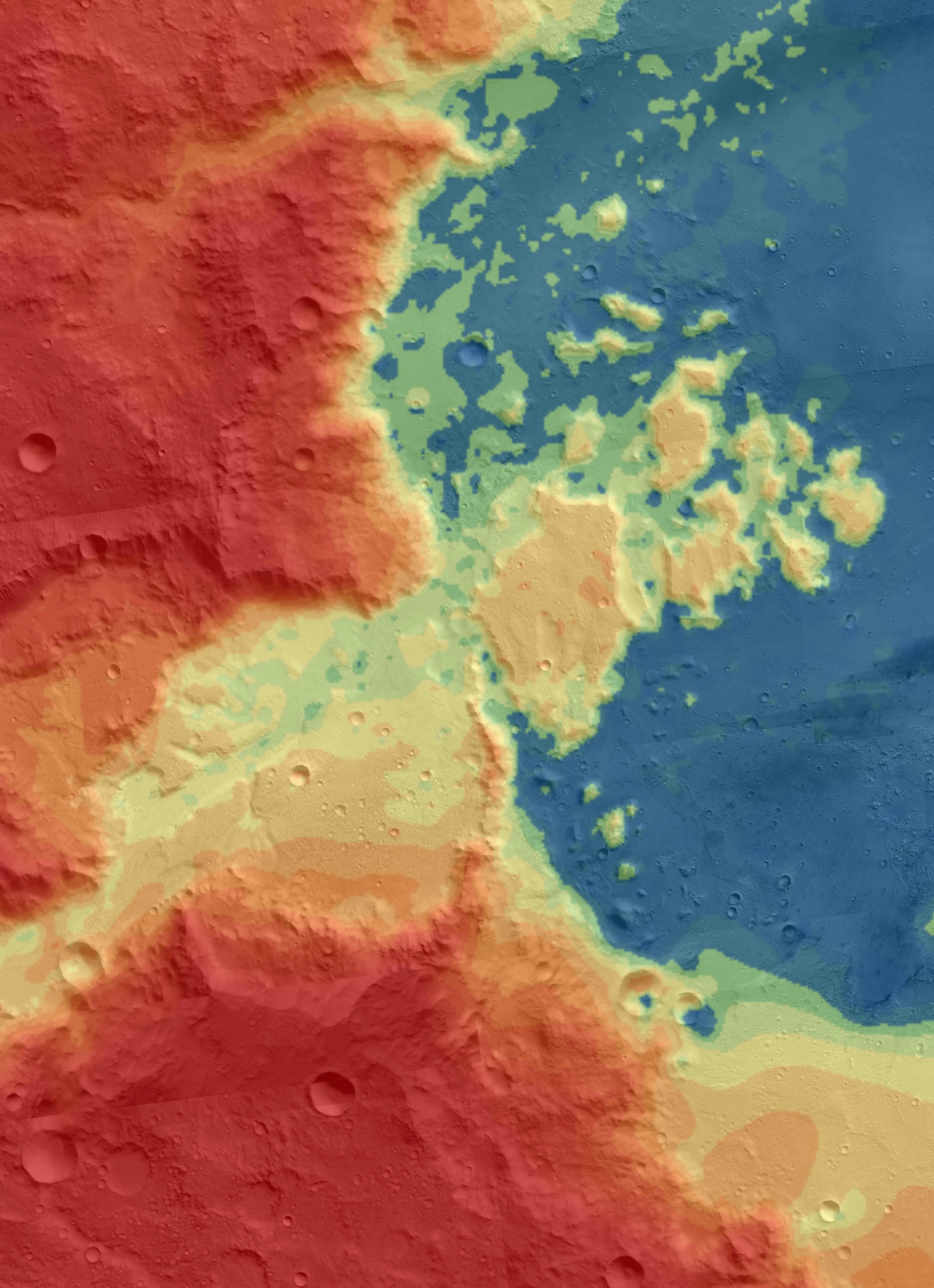 Creamos y estudiamos modelos digitales en 3D de terrenos planetarios y terrestres, fundamentales para la cartografía y exploración espacial, que permiten comprender mejor las superficies de otros mundos y nuestro planeta. Imagen: Modelo digital de elevaciones (MDE) de alta resolución ( 8m pixel) de la desembocadura de Ma’adim Vallis en el delta del cráter Gusev, Marte. Autor: Ronny S. Anangonó Tutasig